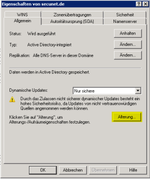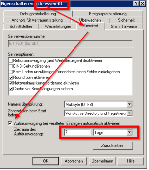Alle DNS-Server markieren DNS-Einträge von Clients, die seit mehr als 14 Tagen nicht an der Domäne angemeldet waren, als ausgealtert. Der DC-ESSEN-01 löscht alle mehr als 7 Tage ausgealterten DNS-Einträge aus dem DNS (nicht aus dem AD!)
